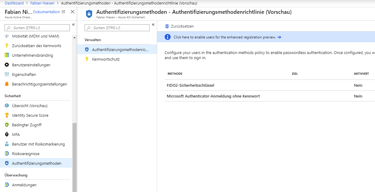 Sie finden die Einstellungen im Azure AD Portal unter „Authentifizierungsmethoden„.